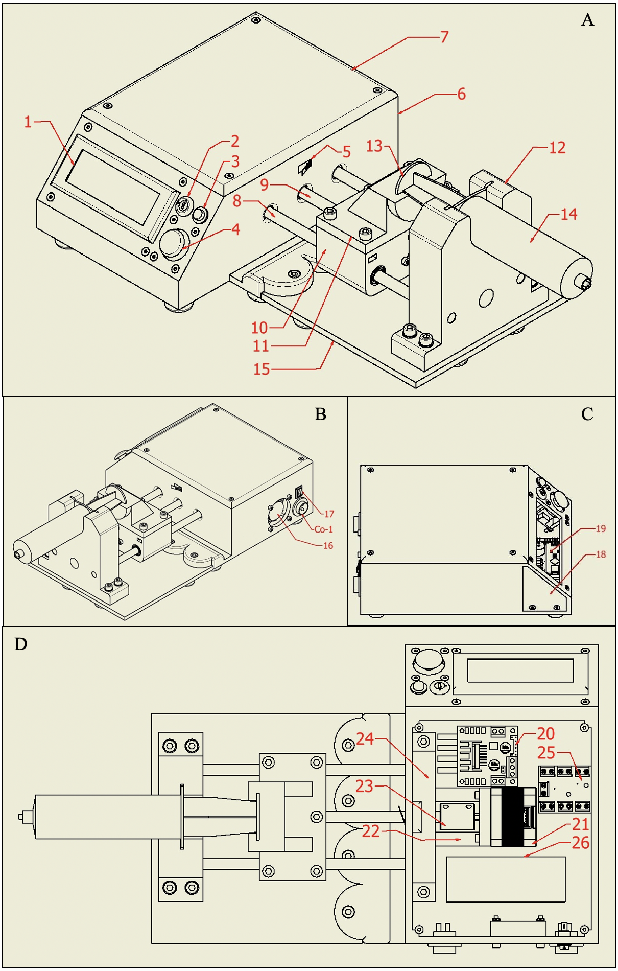 Figura 1. Dosificador Automático/Manual. A. Vista frontal superior. 1. Pantalla LCD 20x4, 2. Interruptor de seguridad, 3. Interruptor de botón push, 4. Joystick, 5. Interruptor de final de carrera, 6. Carcasa impresa parte A, 7. Carcasa impresa parte B, 8. Eje liso de 8 milímetros de diámetro, 9. Varilla roscada de 8 milímetros de diámetro, 4 hilos y 2 milímetros de paso, 10. mesa de desplazamiento, 11. Pieza impresa de agarre de jeringa A, 12. Pieza impresa de agarre para la jeringa B, 13. Embolo de jeringa, 14. Cuerpo de jeringa, 15. Carcasa impresa parte C. B. Vista trasera superior. 16. Ventilador, 17. Interruptor general, Co-1. Conector serial a titulador. C. Vista superior. 18. Tapa lateral impresa. 19. Tarjeta principal de control. D. Vista interna. 20. Puente H de control de motor, 21. Motor a pasos NEMA 17 de 1.8 grados por revolución y 12 volts/500mA, 22. Soporte Impreso para motor Nema 17, 23. Cople rígido de aluminio 5x8mm, 24. Pieza impresa lateral, 25. Tarjeta de distribución de voltajes, 26. Fuente 120VAC a 12VDC 3a 36w.