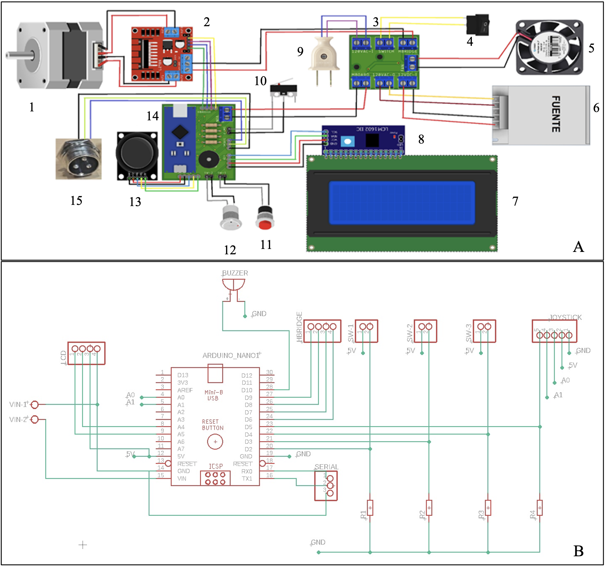 Figura 4. Diagrama de conexiones dosificador. A. Conexiones generales. 1. Motor a pasos, 2. Puente H L298, 3. Tarjeta de distribución de voltajes, 4. Interruptor general, 5. Ventilador, 6. Fuente 127VAC a 12VDC 3 A, 7. Pantalla LCD 20x4, 8. Módulo serial I2C para LCD, 9. Enchufe, 10. Interruptor de final de carrera, 11. Interruptor de botón push, 12. Interruptor de seguridad,13. Joystick, 14. Tarjeta de control con Arduino Nano, 15. Conector serial a titulador.