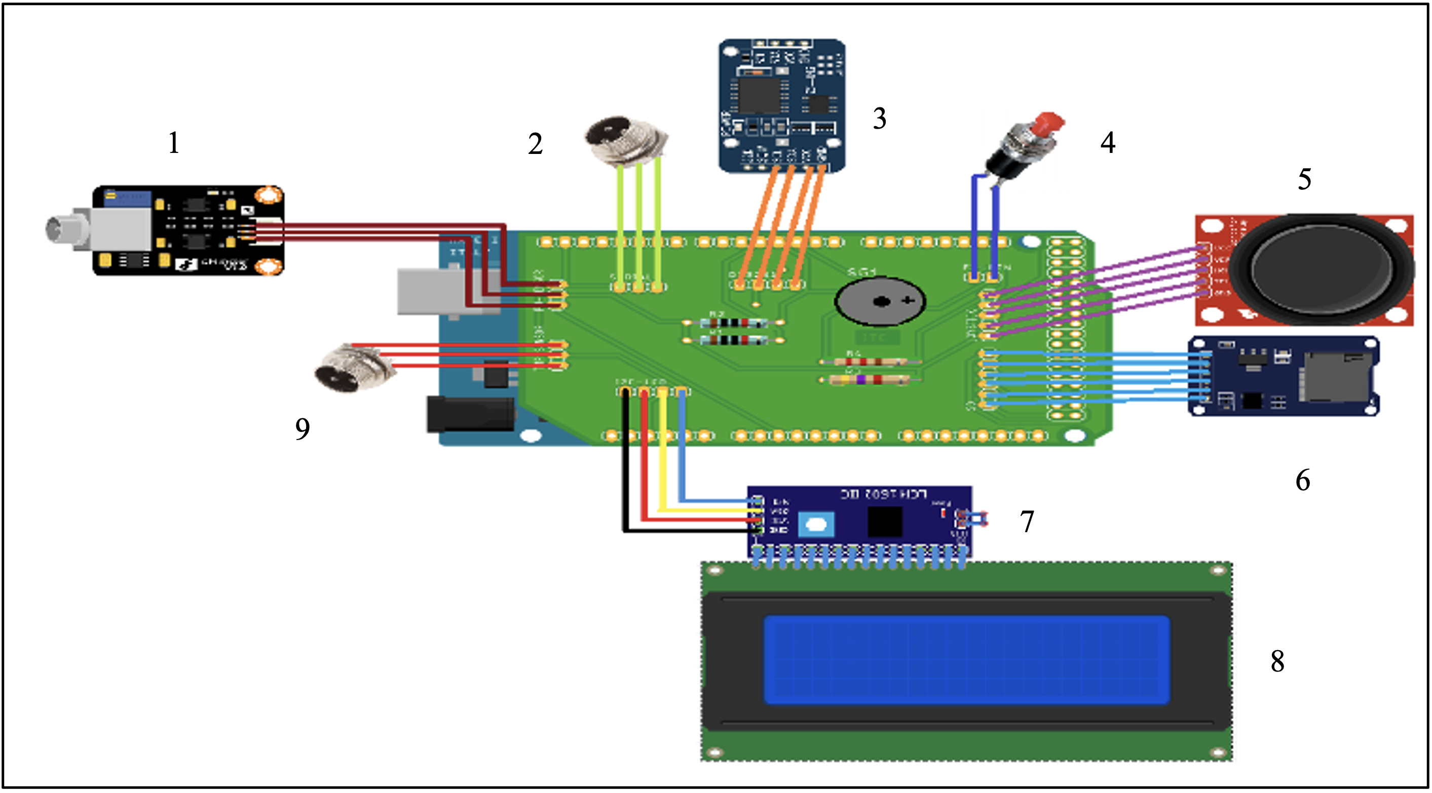 Figura 6. Diagrama de conexiones titulador. 1. Módulo y conector para el sensor de pH. 2. Conector Hembra gx16-3 para comunicación serial 3. Módulo de reloj ds3231 4. Botón “atrás”. 5. Módulo joystick 6. Módulo lector de memorias microSD 7. Módulo I2C para pantallas LCD 8. Pantalla LCD 20x4. 9. Conector Hembra gx16-3 para conexión de sensor de temperatura.