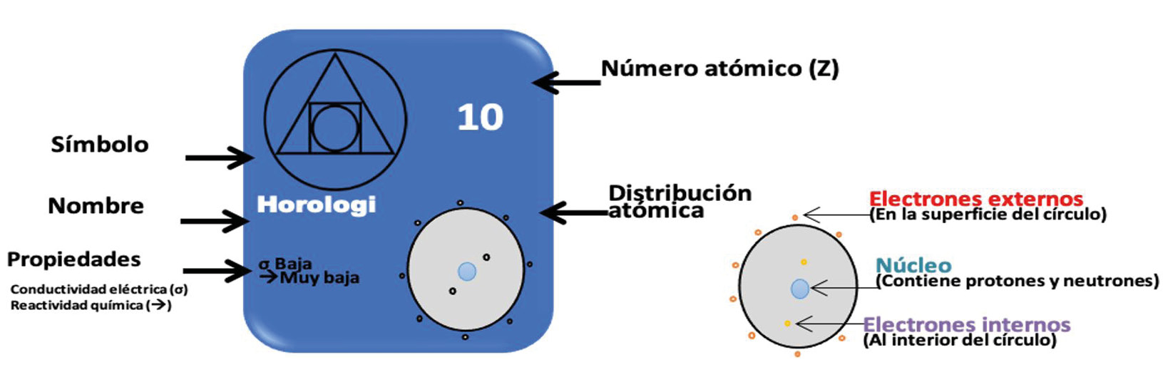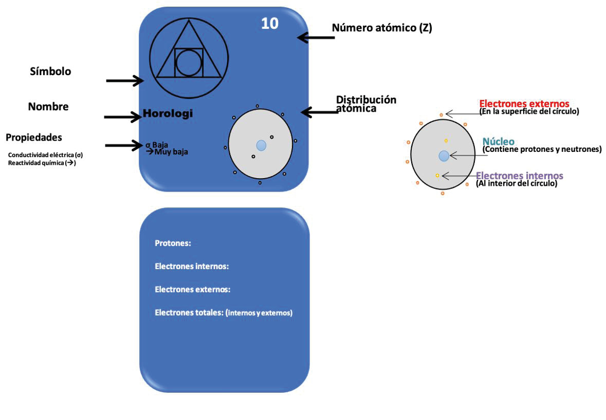 A continuación, se presentan las tarjetas de algunos elementos del sueño de Mendéleyev. Observa e identifica la información de cada elemento, de acuerdo a la descripción que se presenta para la tarjeta del elemento “Horologi” (ver esquema).