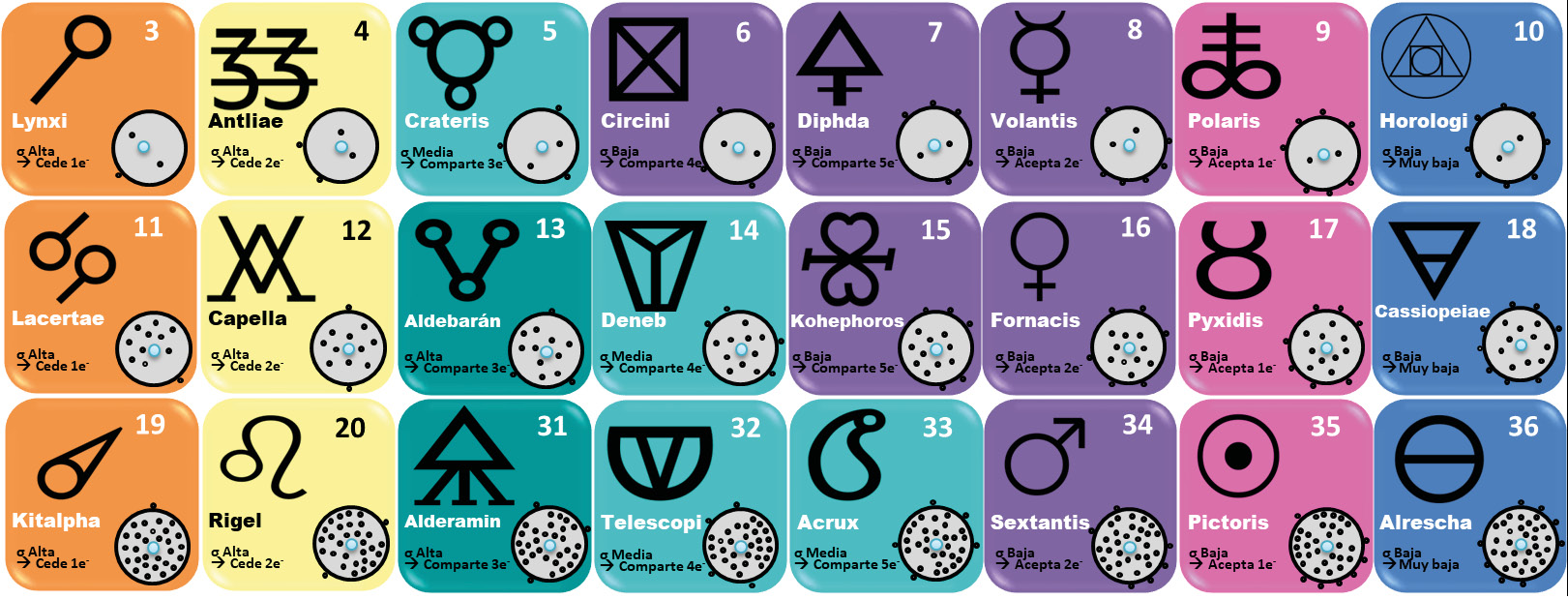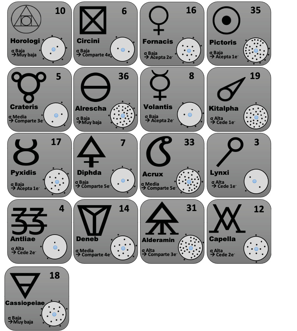 Para la actividad se crearon 24 tarjetas que representan a los elementos de las familias 1, 2, 3, 4, 5, 6 y 7A, de las filas 2, 3, y 4 de la tabla periódica. Como símbolo se propuso, de manera arbitraria, un símbolo alquímico y de la misma manera el nombre de alguna estrella (Se buscaba que los estudiantes no se influenciarán por lo que ya conocen de la tabla periódica). El número atómico y el esquema de distribución atómica (en el que se representa de manera sencilla el núcleo y el número de electrones al interior y exterior del átomo) corresponden con la información conocida de los elementos en la tabla periódica. Y de las 24 tarjetas sólo se les entregan a los estudiantes 17 tarjetas, seleccionadas aleatoriamente procurando que haya al menos un elemento de cada columna (Ver ordenamiento de los elementos en Anexo).