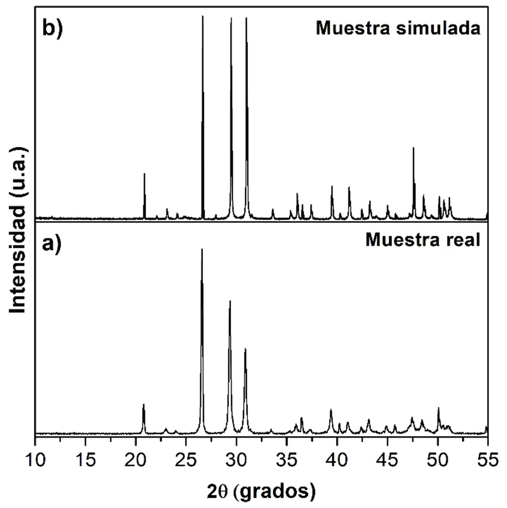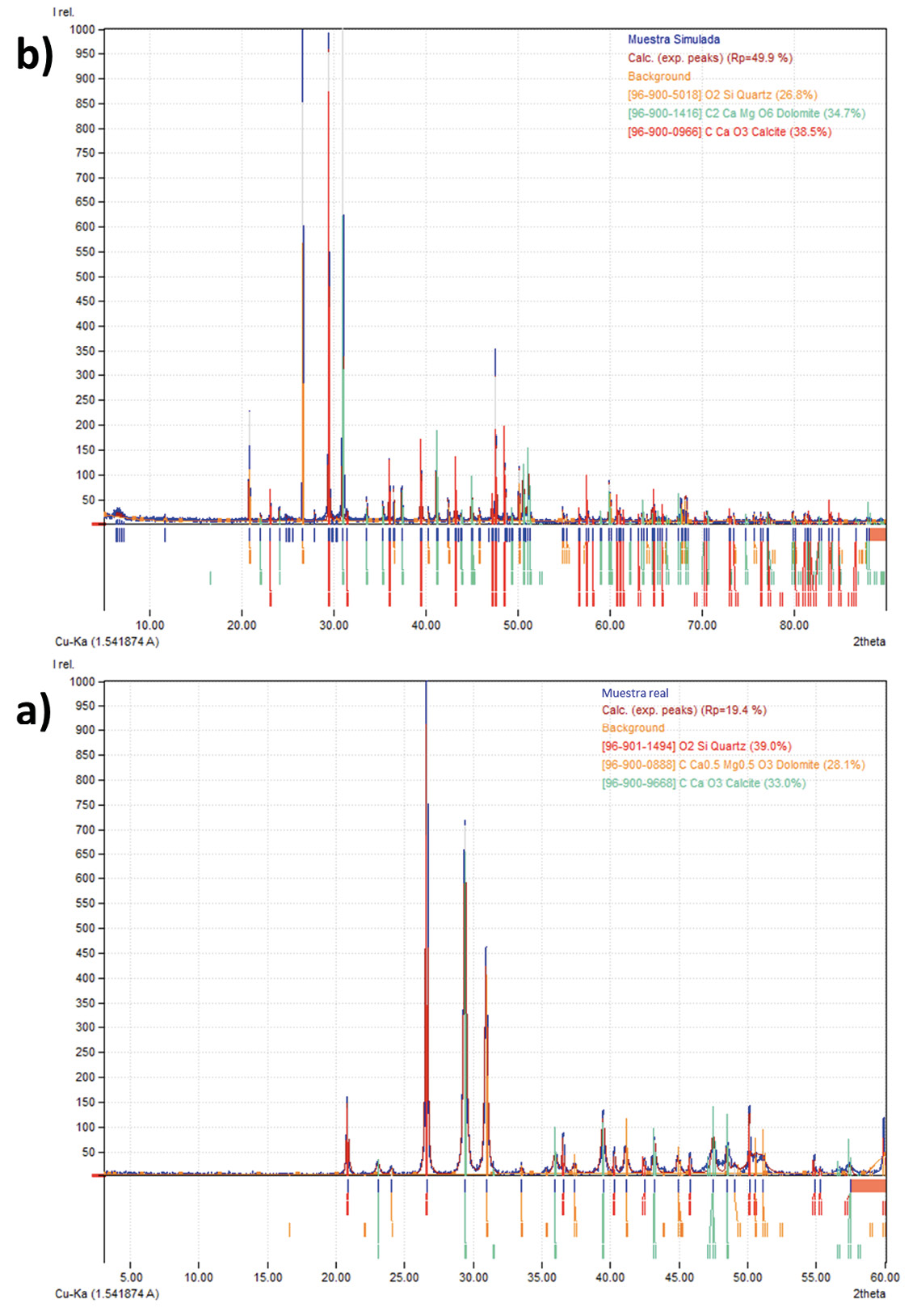 Figura 4. Perfil de difracción de una a) muestra real y una b) muestra simulada. En ambos perfiles de difracción se encuentran las fases cristalinas: cuarzo, dolomita y calcita.