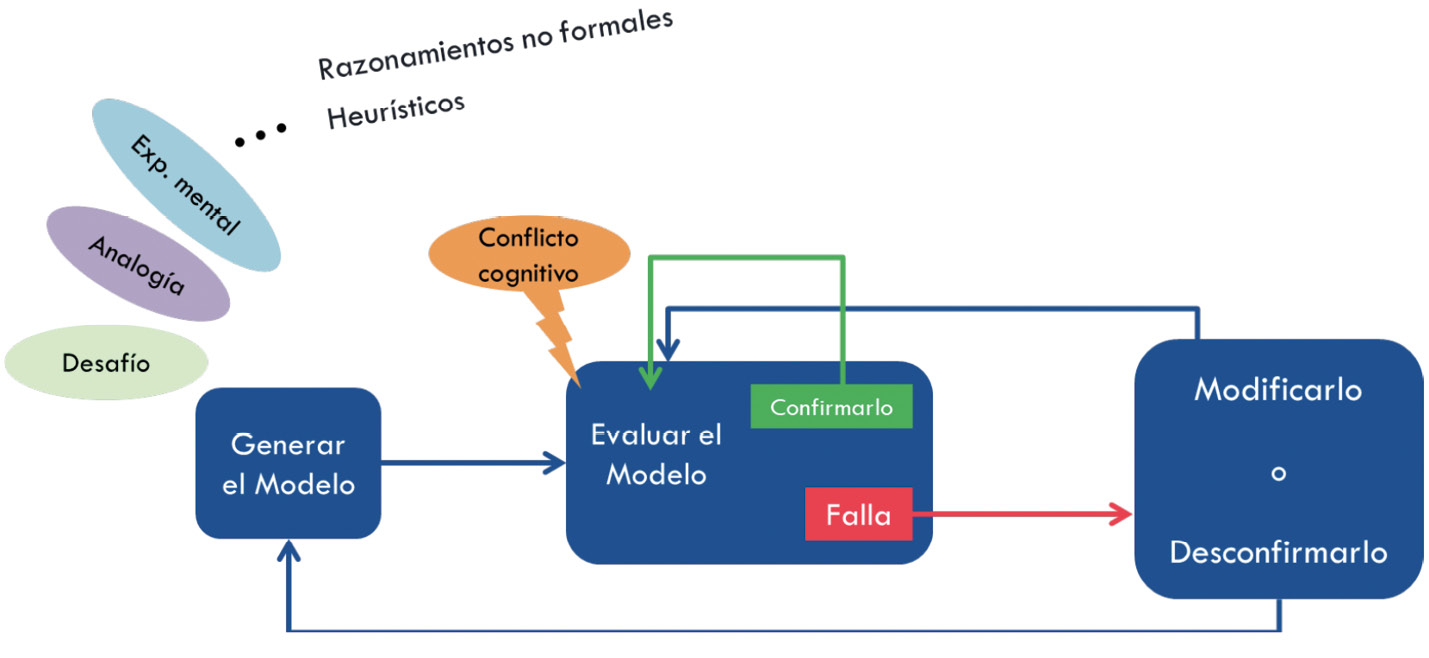 Como el estudiantado posee preconcepciones y razonamientos naturales (Figura 2), no son capaces de asimilar el contenido por un mero trasvasije desde docente hacia oyentes —aproximación conductista—. Por lo mismo, el estudiantado debe realizar su propio camino de aprendizaje hasta llegar lo más que puedan al modelo experto —el contenido que se desea enseñar—, lo que se denomina modelo perseguido (Figura 2). El avance desde las preconcepciones hacia el modelo experto se realiza a través de varios modelos intermedios de refinamiento mediante lo que se conoce como ciclos GEM (Generación, Evaluación, Modificación) y usando el conflicto cognitivo (Perales, 1992).