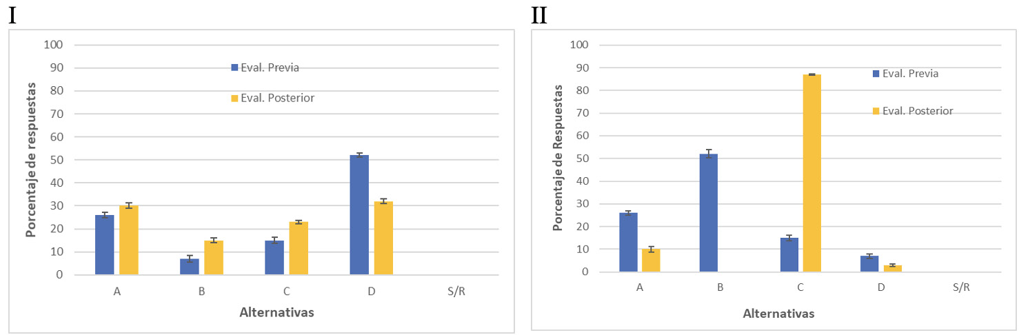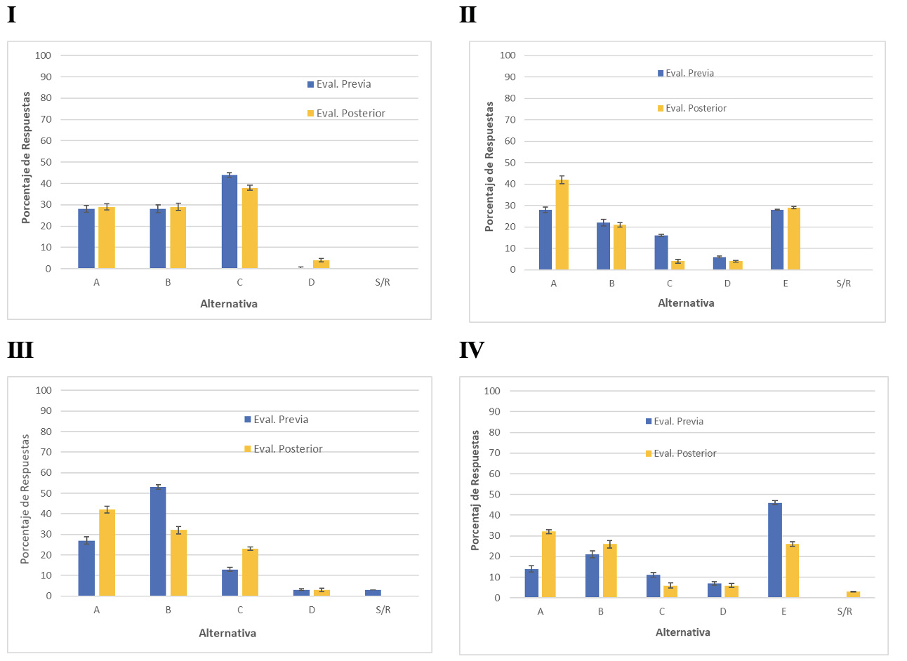 La evaluación para la parte de calor específico consistió en dos preguntas previa y posterior de selección múltiple. En la Figura 6 se muestran los porcentajes de respuesta a las alternativas ofrecidas, siendo las correctas la alternativa A para I y III, y la B para II y IV (ver pregunta en sección Comprobación del aprendizaje mediante evaluaciones).