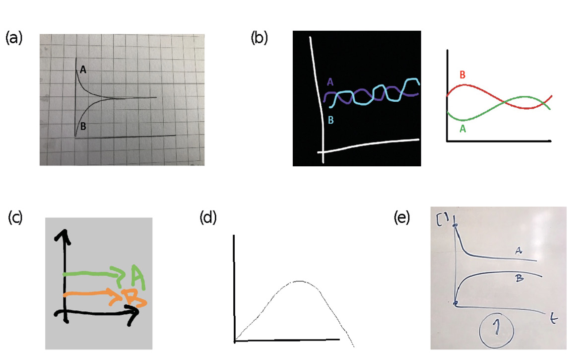Para este ejemplo, el docente le pidió al estudiantado dibujar cómo sería un gráfico de concentración versus tiempo para una reacción del tipo A ⇄ B. Los dibujos son evidencia indirecta importante de los niveles de representación del estudiantado (López-Cortés et al., 2021) y de lo que están pensando (Price et al., 2007), lo que es de relevancia en esta sección. A diferencia de los ejemplos anteriores, la actividad no comenzó con un Forms©, sino que se hizo a partir de los dibujos (ver Figura 7) que el estudiantado hizo y luego se aplicó la votación sobre estos como alternativas.