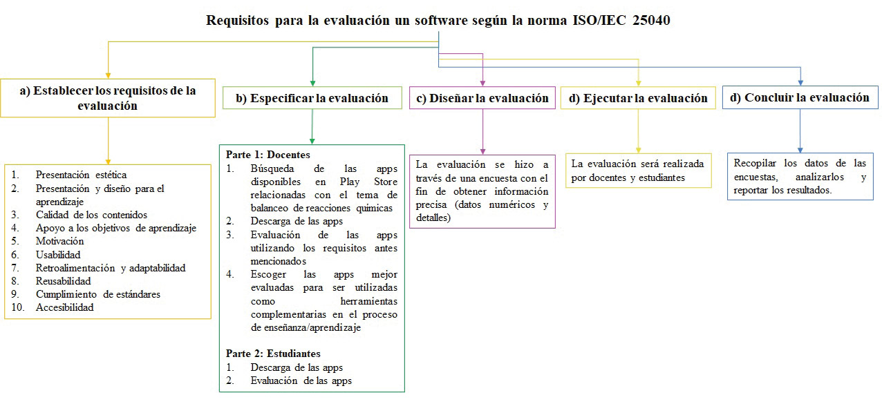 Para llevar a cabo la evaluación de las aplicaciones móviles relacionadas con el tema de balanceo de reacciones químicas, se realizó una búsqueda en Play Store y se seleccionaron 15 aplicaciones. Se evaluaron teniendo en cuenta aspectos enmarcados en la norma ISO/IEC 25040 (ISO, 2021) y en Cháves et al. (2021), según se describe en la figura 1. Con el objetivo y los pasos de la evaluación definidos por Nesbit et al. (2002) y Otamendi et al. (2018), se diseñó una encuesta de evaluación para estudiantes y docentes (ver figura 2). Los docentes evaluaron las aplicaciones en primer lugar, seguidos por los estudiantes.