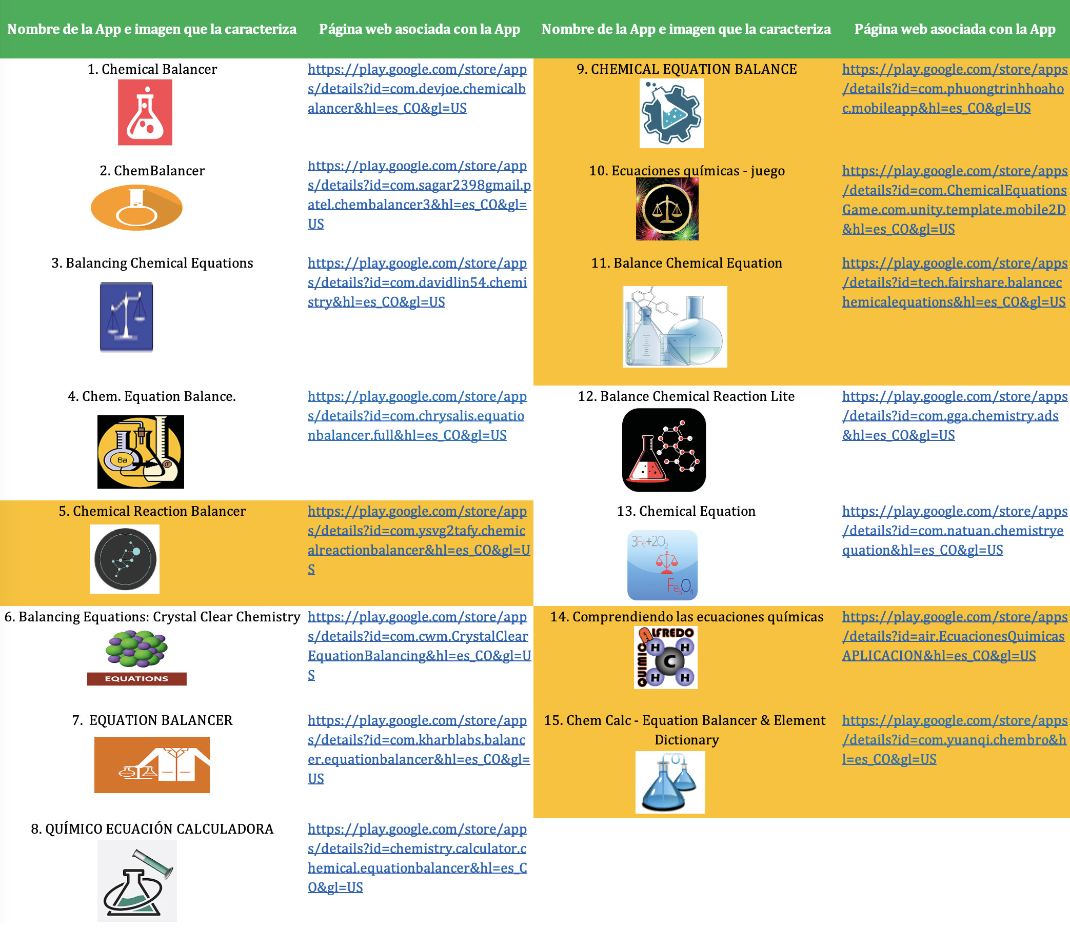 Tabla 1. 15 aplicaciones disponibles en Play Store y 6 —señaladas en color amarillo— que corresponden a las apps aquí evaluadas. Fuente: Elaboración propia