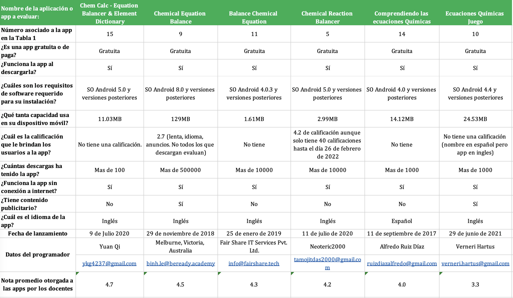 Los docentes seleccionaron 6 de las 15 aplicaciones disponibles en Play Store, las cuales se muestran sombreadas en amarillo en la tabla 1. Para cada una de las aplicaciones No. 5, 9, 10, 11, 14 y 15, se proporcionan detalles sobre su gratuidad, requisitos de software, fecha de lanzamiento, datos del programador, número de descargas, evaluaciones de los usuarios y la nota promedio que otorgaron los docentes en la tabla 2.