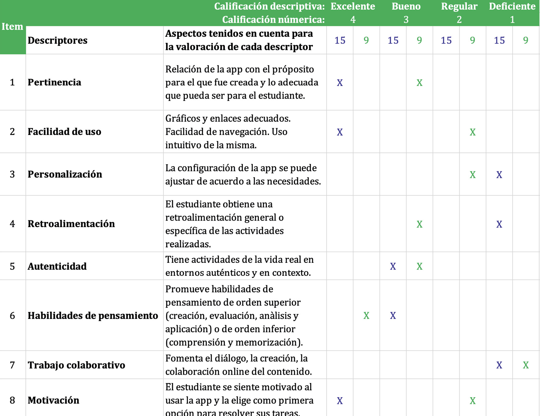 Para la evaluación académica realizada por las docentes se utilizaron descriptores tales como la pertinencia, facilidad de uso, personalización, retroalimentación, autenticidad, habilidades de pensamiento, trabajo colaborativo y motivación. Estos descriptores fueron tomados de la rúbrica de evaluación disponible en Net-Learning (2018), donde se establece que el objetivo principal de la evaluación es seleccionar una aplicación que se adapte a los objetivos de enseñanza y enriquezca el proceso de aprendizaje.