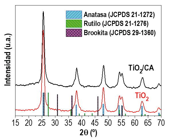 Los patrones de difracción de rayos X (DRX) se utilizan para determinar las fases cristalinas del fotocatalizador. En el caso del TiO2, los diferentes polimorfos son anatasa, rutilo y brookita. Como se puede observar en la Figura 1, los materiales sintetizados presentaban los picos característicos de la fase anatasa (según el Joint Committee on Powder Diffraction Standards, JCPDS 21-1272). Por el contrario, ningún otro pico estaba relacionado con la estructura cristalina del rutilo o de la brookita (o incluso del CA en la muestra de TiO2/CA). En este sentido, la anatasa es la fase cristalina más utilizada para aplicaciones fotocatalíticas, debido a una mayor movilidad de los portadores de carga (pares electrón-hueco), lo que suele traducirse en un incremento de la actividad fotocatalítica (Luttrell et al., 2015; Zhang et al., 2014). Como también se observa en la Figura 1, los patrones de DRX de ambos materiales preparados (TiO2 con y sin soporte) son similares, lo que indica que la presencia de CA en la síntesis solvotermal no causó diferencias importantes en el desarrollo de la estructura cristalina del TiO2.