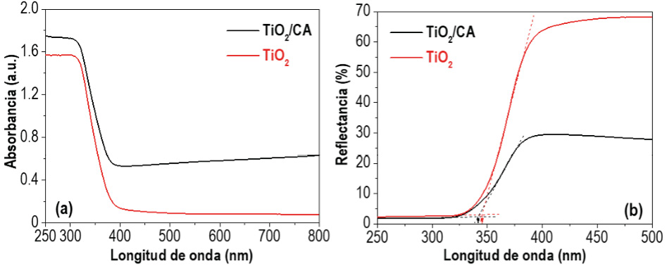 Figura 2. Espectro de (a) absorbancia y (b) reflectancia de los fotocatalizadores preparados en el intervalo UV–visible.