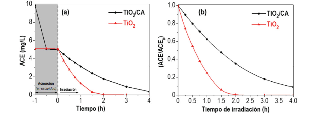 Los rendimientos fotocatalíticos típicos de los materiales sintetizados en la eliminación del ACE bajo luz solar se muestran en la Figura 3. Es importante destacar que, debido a la diferente adsorción de cada fotocatalizador (soportado o no), la concentración inicial del contaminante en la disolución es diferente dependiendo del material utilizado. En este sentido, como se observa en la Figura 3a, se dispersó el TiO2/CA en una disolución de 10 mg·L–1 del ACE antes de la etapa de adsorción. De forma previa al inicio de la irradiación, la concentración del contaminante se cuantificó en torno a 5 mg·L–1, indicando una alta adsorción del contaminante como consecuencia de la presencia del CA en el fotocatalizador soportado (alrededor del 20% en peso). Por el contrario, la adsorción del ACE en el TiO2 sin soportar puede considerarse despreciable. Por tanto, la muestra de TiO2 fue dispersada en una disolución de 5 mg·L–1 del ACE, asegurando de este modo que ambos experimentos fotocatalíticos son llevados a cabo con una concentración del ACE similar tras el equilibrio de adsorción. Este procedimiento permite, por tanto, que los rendimientos fotocatalíticos sean comparados de forma adecuada, como muestra la Figura 3b. Los perfiles de evolución de la concentración relativa del ACE ([ACE]/[ACE0], siendo [ACE0] la concentración inicial y [ACE] la concentración a un determinado tiempo de reacción) indican que el TiO2 sin soportar presentaba un mejor rendimiento fotocatalítico. Los valores similares de los band gaps sugieren que la menor conversión mostrada por el TiO2/CA puede atribuirse a una menor accesibilidad del semiconductor cuando se encuentra soportado (Leary y Westwood, 2011).