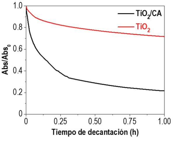Además de lo anterior, la evaluación del fotocatalizador se completa con un ensayo de decantación. Para ello se colocan en una cubeta de cuarzo 2 mL de una suspensión 1 g·L–1 del fotocatalizador. La absorbancia se mide de forma continua durante 1 h en un espectrofotómetro Shimadzu 2600 UV–vis (utilizando agua desionizada como muestra de control) a l = 600 nm (de forma que la extinción de luz a esa longitud de onda se produzca por la dispersión causada por las partículas). Además, el ensayo de decantación puede también realizarse registrando el perfil de sedimentación, para lo cual se sitúan 100 mL de la suspensión de fotocatalizador en una probeta graduada.