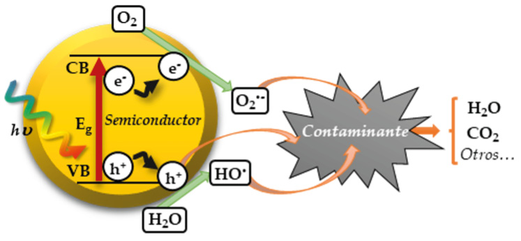 La fotocatálisis heterogénea es una tecnología que ha recibido un creciente interés en los últimos años para la eliminación de contaminantes tanto en fase gaseosa como acuosa. El término “catálisis” puede definirse como el incremento de la velocidad de una reacción, mientras que “foto” significa que el proceso se inicia tras la irradiación y absorción de luz en un material (normalmente un semiconductor, que recibe el nombre de fotocatalizador). Todos los fotocatalizadores (como materiales semiconductores) presentan una banda de valencia (BV) totalmente ocupada con electrones y una banda de conducción (BC) libre de estos, siendo la energía de banda prohibida o band gap (Eg) el nombre que recibe la diferencia energética entre ambas bandas en el fotocatalizador. Además, la fotocatálisis se considera un proceso avanzado de oxidación (PAO), ya que la conversión de los contaminantes se realiza mediante la generación de especies reactivas de oxígeno (ROS, por sus siglas en inglés, por ejemplo, radicales hidroxilos, HO• o aniones radicales superóxido, O2•–), que se caracterizan por presentar un alto poder oxidante. En el caso de la fotocatálisis, los siguientes pasos (mostrados en las ecuaciones (1)-(4) y esquematizados en la Figura S3) se producen entre la irradiación del fotocatalizador y la generación de las ROS (todos estos pasos ocurren en una escala de tiempo de 10–15 a 10–12 s) (Belver et al., 2019, 2020; Carp et al., 2004):