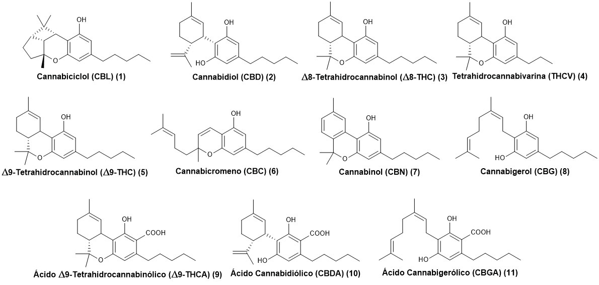 Actualmente, se han aislado más de 565 compuestos diferentes de Cannabis sativa, entre los cuales se encuentran los cannabinoides, terpenoides, flavonoides y alcaloides, entre otros (Bonini, 2018; Li, 2020). Cabe destacar, que más de 120 del total de los compuestos identificados corresponden al grupo de cannabinoides (Figura 2), los cuales son los principales compuestos responsables de las propiedades psicoactivas que posee la planta (Bonini, 2018; Li, 2020).