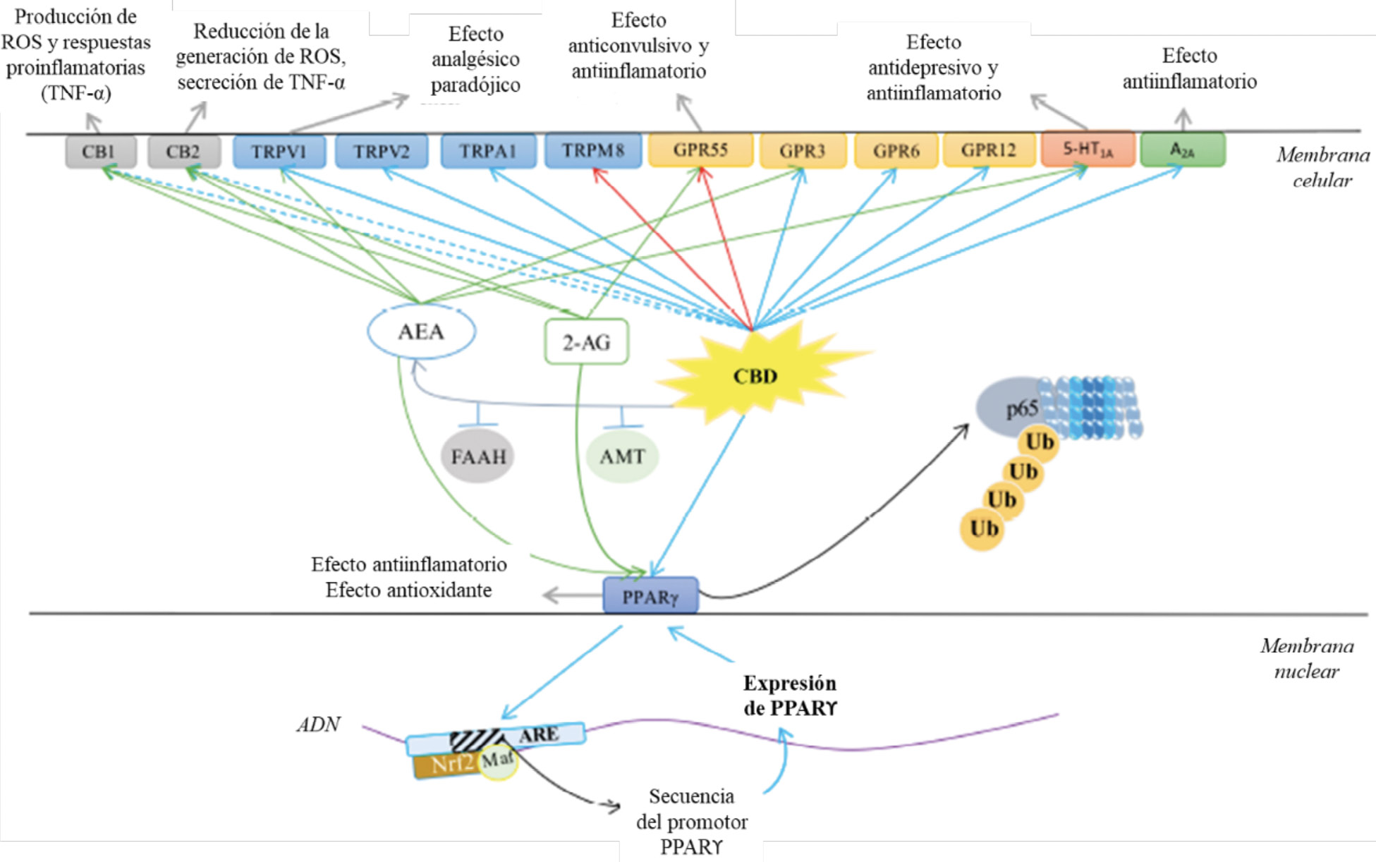 Figura 3. Efectos terapéuticos de CBD (2) según su interacción con distintos receptores.