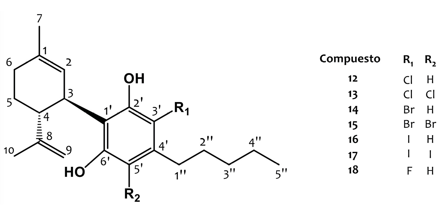 Diversos análogos de CBD fueron sintetizados mediante la incorporación de halógenos. En el trabajo de Usami y col. (1999), se describe la síntesis de derivados mono y dihalogenados de (-)-CBD. Para ello, fueron sustituidos ciertos hidrógenos del anillo fenólico por átomos de cloro, iodo y bromo. En cuanto a su actividad biológica, a comparación del control (CBD), los derivados monohalogenados 12, 14 y 16 (Figura 5) prolongaron el tiempo de sueño mediante la inhibición del metabolismo hepático de los barbitúricos utilizados para dicha sedación. Mientras que los derivados dihalogenados 13, 15 y 17 (Figura 5), si bien demostraron mejorar el efecto sedante con respecto al control, el mismo no fue significativo. Por otra parte, Breuer y col. (2016) reportan la síntesis del derivado monofluorado 18 (Figura 5). Este compuesto demostró mayor potencia que el (-)-CBD en la inducción de efectos antinociceptivos en ratones. A su vez, esta nueva entidad química demostró importantes efectos ansiolíticos, antidepresivos y antipsicóticos (Li, 2020).