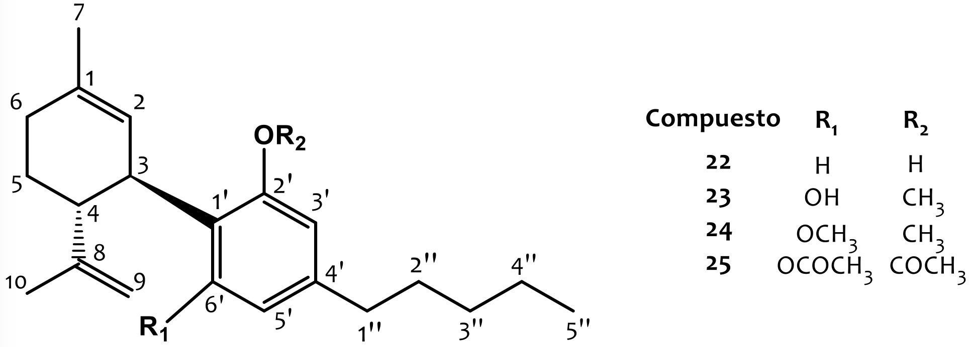 En esta sección se citan los compuestos derivados de (-)-CBD que poseen una modificación química en el núcleo resorcinol, cuya actividad biológica se encuentra reportada. Se exceptúan las modificaciones correspondientes a la posición C-4’, las cuales se detallarán más adelante.