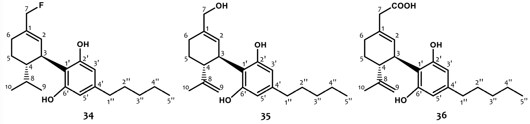 Breuer y col. (2016) sintetizaron el derivado halogenado de (-)-8,9-H2-CBD, con un átomo de flúor en el metilo C-7 (34) (Figura 11), aunque su actividad antipsicótica, antidepresiva y ansiolítica no resultó ser significativa (Li, 2020; Breuer, 2016).