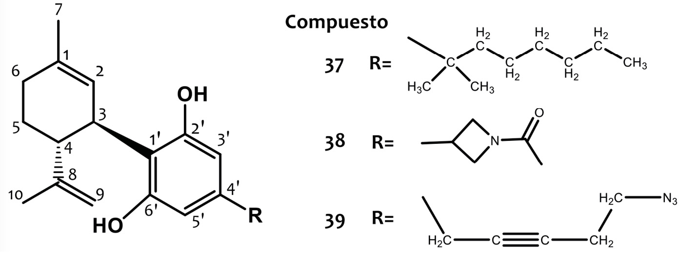 La molécula de CBD posee una cadena de n-pentilo unida al C-4’ del anillo aromático y se han informado diversos derivados sintéticos con variaciones en esta cadena alquílica. Basados en trabajos previos de Mechoulam y col. (1988), en los que la sustitución de la cadena pentilo del Δ9-THC por la cadena alquílica lipofílica 1’,1’-dimetilheptilo (DMH), resultó en compuestos más activos que el Δ9-THC, se hipotetizó que podría ocurrir lo mismo para el caso del andamio CBD. Por lo tanto, la síntesis de DMH-CBD ha sido informada por el grupo de Mechoulam, donde la introducción de la cadena alquílica de DMH en (-)-CBD no afectó la afinidad de éste por los receptores CB1 y CB2. En cuanto a la actividad medicinal, (-)-DMH-CBD (37) (Figura 12) ha mostrado propiedades antiinflamatorias y antiproliferativas en leucemia mieloide aguda humana, células T microgliales o encefalitogénicas (Leite, 1982; Hanus, 2005; Mechoulam, 1990; Juknat, 2016).