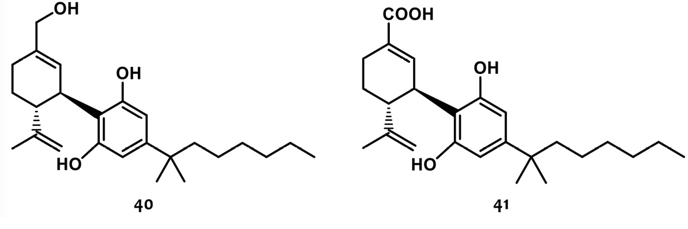 Anteriormente se habló del compuesto 37, DMH-CBD, en el que la cadena pentilo del CBD fue sustituida por la cadena alquílica DMH. A partir de éste, se realizaron nuevas modificaciones sintéticas para la obtención de análogos de CBD doblemente modificados (Leite, 1982; Hanus, 2005; Mechoulam, 1990). Estas nuevas entidades mostraron bioactividades mejores que el (-)-CBD, tales como efectos ansiolíticos, analgésicos, antiinflamatorios o antiproliferativos en diversos ensayos (Burstein, 2015; Fride, 2005; Pertwee, 2005; Sumariwalla, 2004). Así, el 7-OH-DMH-CBD (40) y el 1-COOH-DMH-CBD (41) (Figura 13) demostraron ser potenciales antidiarreicos y antiinflamatorios para el tratamiento de la enfermedad inflamatoria intestinal y la fibrosis quística, mientras que el compuesto 40 mostró unirse moderadamente a los receptores CB2 y resultó ser un inhibidor de la captación de anandamida, por lo que podría ser utilizado como antagonista del receptor de cannabioides (Fride, 2005). A su vez, 40 exhibió una potente inhibición de las contracciones evocadas eléctricamente de los conductos deferentes del ratón que no fue mediada por CB1, CB2, TRPV1, opioides o receptores A2-adrenérgicos (Morales, 2017). Mientras que 41, indujo efectos antiinflamatorios e inmunosupresores, en un modelo in vivo de artritis inducida por colágeno (Sumariwalla, 2004).