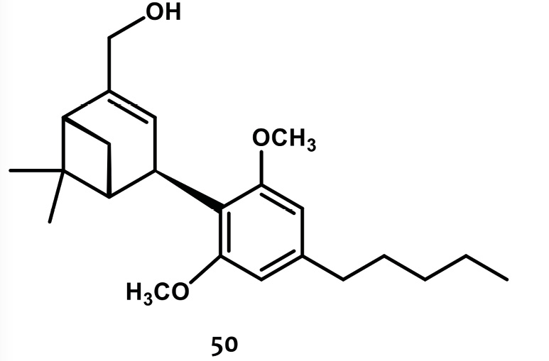 Finalmente, uno de los derivados más conocidos de CBD que se puede mencionar en esta sección, es el derivado de α-pineno dimetoxi-DMH-CBD (50) (Figura 16), producto de la condensación del grupo resorcinol con el 4-hidroximyrtenil pivalato, cuya síntesis está descrita en el trabajo de Hanus y col. (1999). Se trata de un potente agonista periférico selectivo de CB2 (Mechoulam, 1990; Hanus, 1999), que, además, ha mostrado propiedades antiinflamatorias, analgésicas, neuroprotectoras y antitumorales. A su vez, se ha utilizado como herramienta farmacológica en numerosos estudios de cannabinoides que han contribuido al conocimiento en este campo (Burstein, 2015; Hanus, 1999; Ofek, 2006; Rajesh, 2007 a y b). Más recientemente, se ha probado su eficacia en la pérdida ósea inducida por la ovariectomía y la inflamación del oído (Smoum, 2015), mostrando una relación inversa entre la afinidad de unión y la potencia biológica.