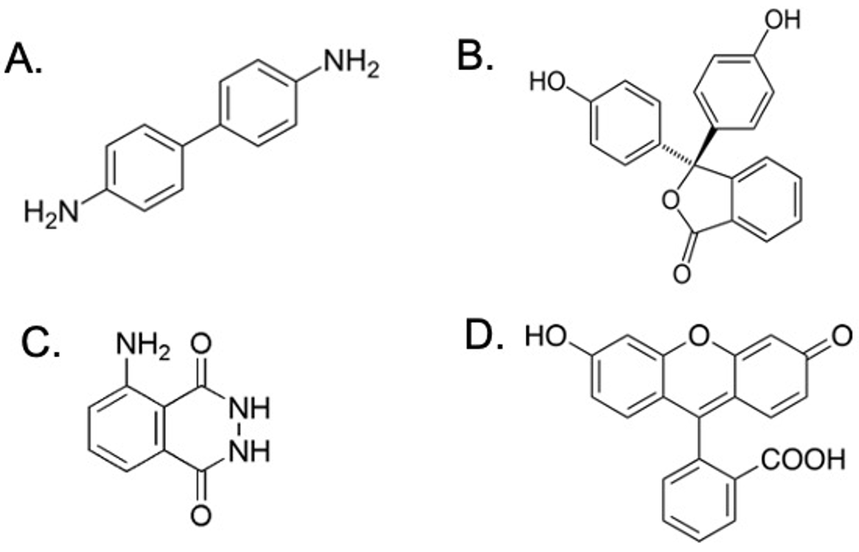 Figura 3. Estructura de reactivos empleados en pruebas presuntivas de sangre, se muestran de manera reducida. A.Bendicina. B.Fenolftaleína. C. Luminol y D. Fluoresceína.