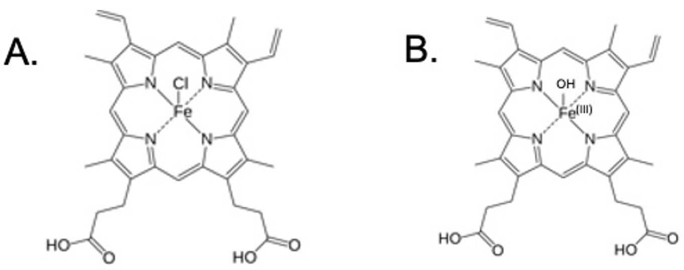 Figura 4. Estructura de la hemina (A) y del hemocromógeno (B). Ambos forman cristales en las pruebas de Teichmann y Takayama, respectivamente.