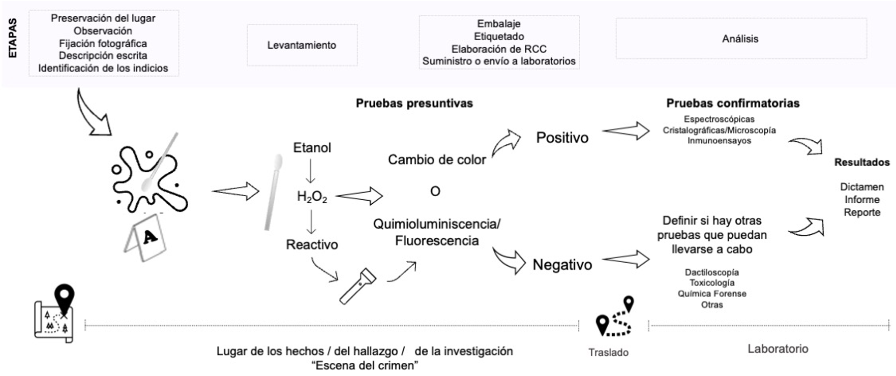La figura 5 muestra de manera general el proceso que se lleva a cabo durante la investigación de un hecho presuntamente delictivo. En la parte superior se muestran las etapas que las personas encargadas de realizar el procesamiento de un lugar donde se sospecha ha ocurrido un delito llevan a cabo, es decir la preservación del lugar, la observación para identificar indicios —llamados comúnmente evidencias— posteriormente la fijación fotográfica seguida de la descripción por escrito. Una vez que los indicios han sido identificados se realizan las pruebas presuntivas, llevando a cabo el levantamiento mediante diversos medios, por ejemplo hisopos estériles. El siguiente paso es la aplicación de las pruebas presuntivas y si estas son positivas se recolecta el indicio y éste es embalado, etiquetado y se realiza el Registro de Cadena de Custodia para su traslado al laboratorio donde se aplican pruebas confirmatorias. Si se obtiene un resultado negativo en las pruebas presuntivas, se debe evaluar si el indicio puede ser analizado por otra disciplina de la Ciencia Forense, por ejemplo un vaso en el que se evalúa una mancha en el borde y esta resulta negativa para sangre pero presenta huellas dactilares éste podría ser enviado a lofoscopía para el revelado de las mismas. Finalmente las personas que realizan los análisis emiten un dictamen, informe o reporte en que asientan sus hallazgos para que esta información pueda ser incorporada a la Carpeta de Investigación del caso.