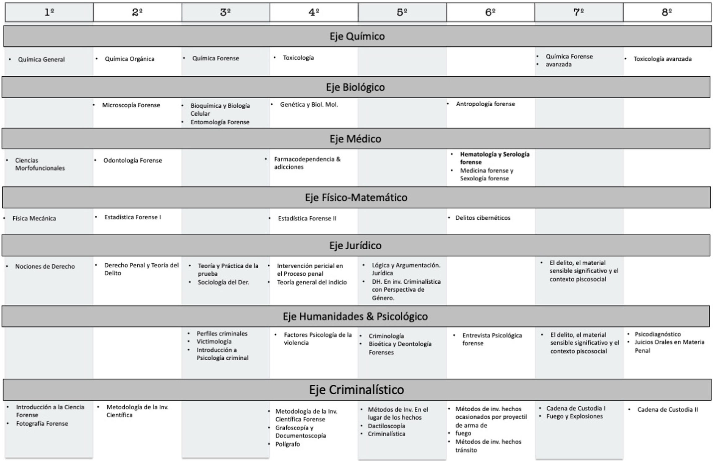 Tabla 1. Ejes del Plan de estudios de la Licenciatura en Ciencia Forense. Elaborada con base en el documento “Criterios para la Evaluación del Personal Académico de la Licenciatura en Ciencia Forense”. Publicado en la gaceta de la Facultad de Medicina el 8 de noviembre del 2017.