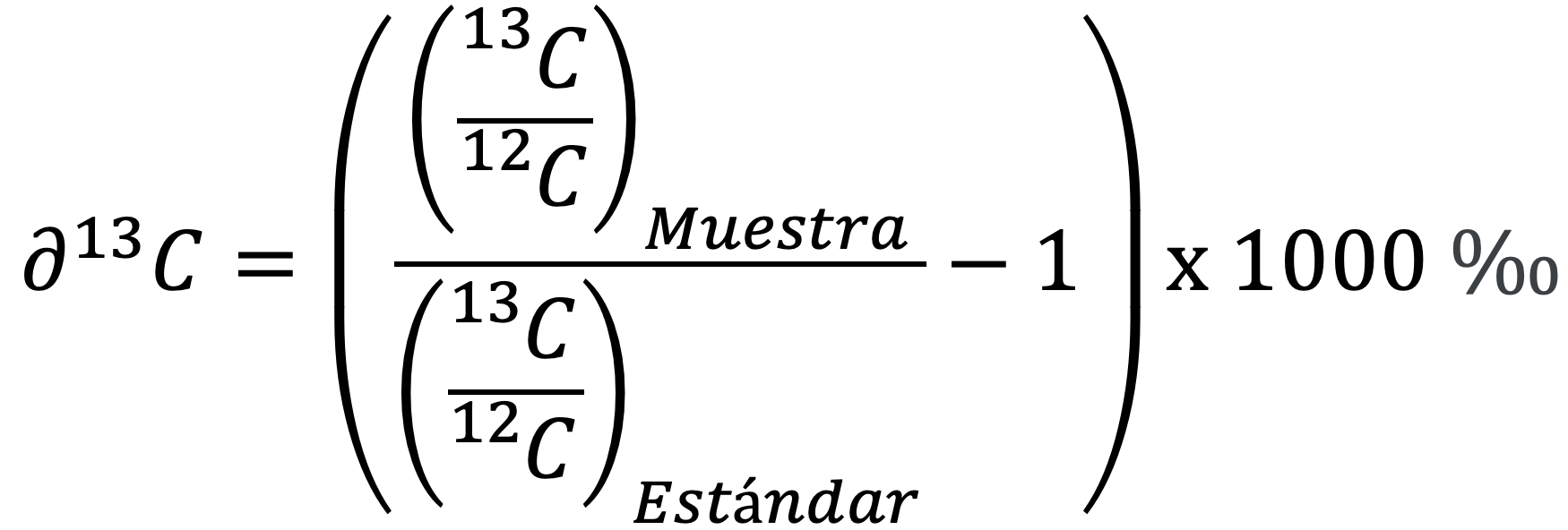 Por ejemplo, la δ13C se calcula refiriéndola a un estándar de proporciones 13C/12C conocidas y se expresa como: