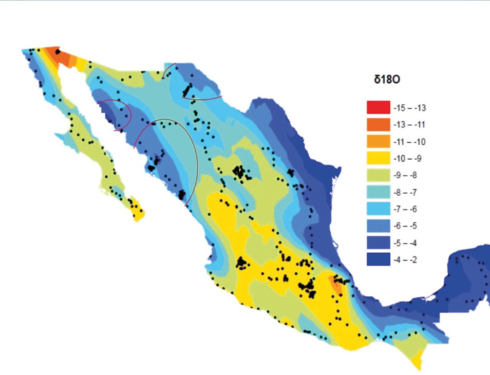 Figura 3. Ejemplo del mapa isotópico con las variaciones en las proporciones de 18O (δ18O) de las aguas naturales en la República Mexicana. (Rebeles, 2017).