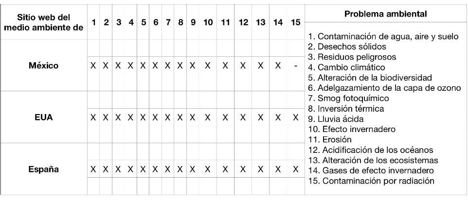 Con la finalidad de mapear si los problemas ambientales que se estudian en el bachillerato son de interés nacional, en 2017 se visitaron los sitios web de la Secretaría del Medio Ambiente y Recursos Naturales (SEMARNAT) y sus equivalentes en los Estados Unidos y España, para buscar entre los comunicados y noticias publicadas, menciones explícitas de dichos problemas. La tabla 2 condensa los resultados obtenidos: