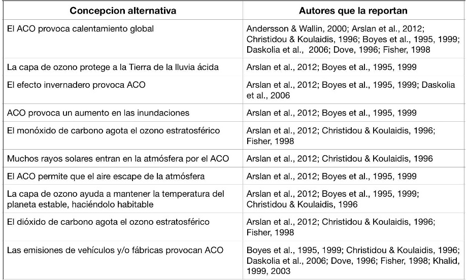 Por lo anterior, el siguiente paso en nuestra investigación fue indagar las concepciones alternativas que los estudiantes de bachillerato presentan acerca del adelgazamiento de la capa de ozono. Para ello, se realizó una búsqueda en la literatura especializada; se encontraron investigaciones al respecto de Argentina, Australia, Canadá, EUA, España, Grecia, Rusia, Suecia y Turquía, pero ninguna de estudiantes mexicanos y muy pocos de otros países latinoamericanos.