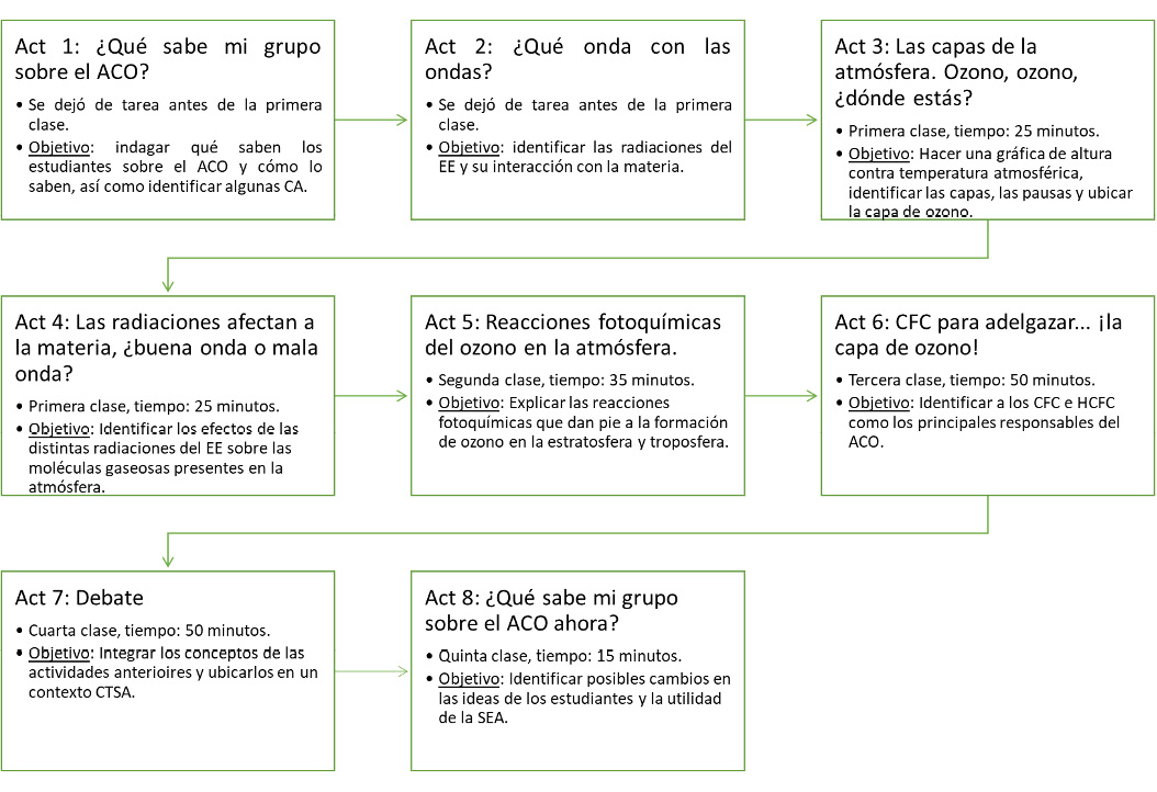Para la comprensión del adelgazamiento de la capa de ozono, es fundamental que los estudiantes comprendan que el espectro electromagnético está conformado por radiaciones con propiedades diversas y, por ello, al interactuar con la materia, los efectos son distintos. Es importante también que identifiquen las cuatro capas en las que se divide la atmósfera y observen sus características. Que conozcan las propiedades físicas y químicas del ozono y reconozcan que se trata de la misma sustancia en la troposfera y la estratosfera, pero forma parte de ciclos fotoquímicos diferentes. Que identifiquen a los CFC y los HCFC como los principales responsables del ACO. Finalmente, que propongan acciones de mitigación individuales, sociales y políticas con base en argumentos científicos construidos de la información anterior. Con estas ideas en mente se diseñó una secuencia de enseñanza aprendizaje (SEA) en la búsqueda de una comprensión más significativa de este tema en los estudiantes de bachillerato.