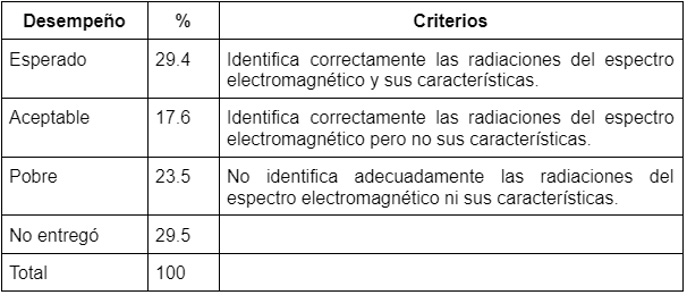 Como tarea de la clase previa al inicio del tema, se pide a los estudiantes analizar un video y responder al cuestionario: Cuestionario del EE.pdf. La siguiente sesión se hizo una lluvia de ideas y se pidió realizar un diagrama del espectro electromagnético con lo visto en el video. Los resultados se clasificaron de acuerdo a los siguientes criterios: