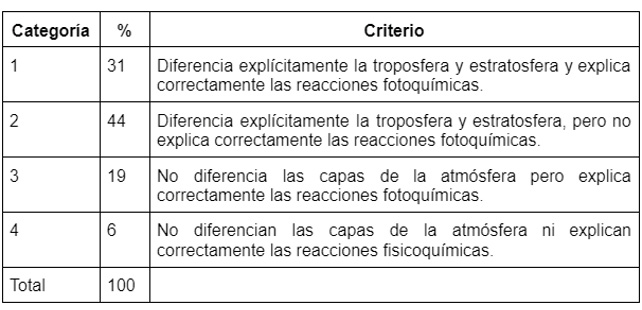 Tras el análisis de las reacciones fotoquímicas, el 21 % de las explicaciones de los estudiantes se vuelven más formales, por ejemplo: “no es como tal un adelgazamiento, sino que la cantidad de ozono disminuye en la estratosfera terrestre” o “es la disminución de la cantidad de ozono en la estratosfera”. Sin embargo, el 10.5 % presenta aún traslape conceptual: “está aumentando debido a que los gases de efecto invernadero destruyen las moléculas de ozono”.