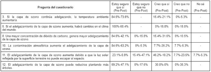 Los estudiantes que pensaban con certeza que el ACO empeoraba por radiación solar que no puede escapar al espacio pasan de 23.1 a 5.9 %, mientras que la certeza de que lo anterior no sucede pasa de 15.4 a 47.1 %. Atribuimos este resultado a un mejor conocimiento de las radiaciones del espectro electromagnético y a haber estudiado las reacciones fotoquímicas relacionadas con el ozono atmosférico.