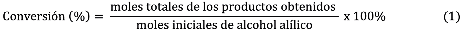 La conversión está relacionada directamente con relación entre la cantidad de productos generados respecto a la cantidad de reactivos iniciales. En el caso de la reacción de isomerización del alcohol alílico, se tiene en cuenta la cantidad de productos respecto a los 3.44 mmol de alcohol alílico bajo cada una de las atmósferas de reacción consideradas. Ec. (1), muestra el cálculo empleado.