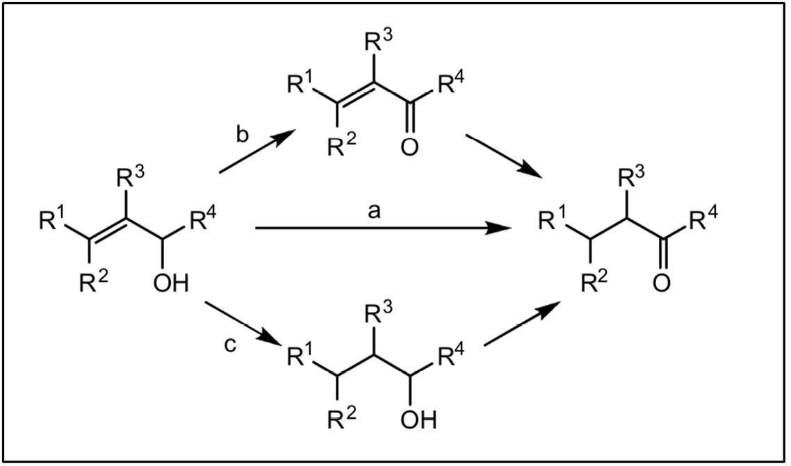 En la Figura 2, se muestra la obtención típica de compuestos carbonílicos saturados a partir de alcoholes insaturados, la cual es una ruta que comprende dos etapas: i) la oxidación del grupo hidroxilo (transformación b) y ii) la reducción del doble enlace C-C (transformación c). Mediante una isomerización RedOx de un alcohol α-β instaurado, empleando el catalizador adecuado, es posible generar el carbonilo saturado correspondiente en una única etapa de reacción (transformación a).