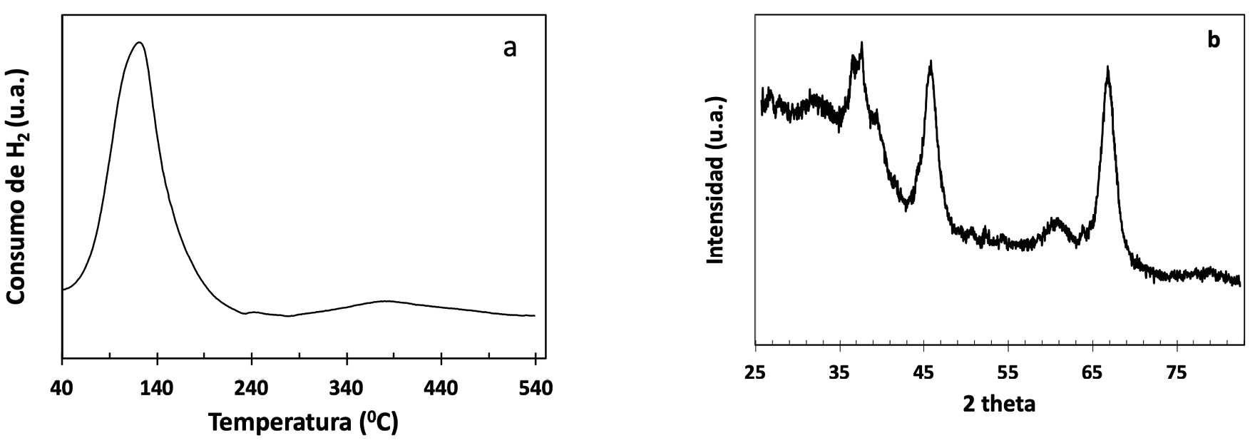 Mediante la técnica de difracción de rayos X, se puede comprobar la presencia de rutenio metálico en el catalizador después de realizar la reducción. En la Figura 3b, se evidencia la formación de un pico a 43.8º 2θ debido a la difracción del plano (101) del rutenio hexagonal compacto (hcp). Los picos a 37 y 67º, son característicos de γ-Al2O3 (ICDD 00-010-0425).