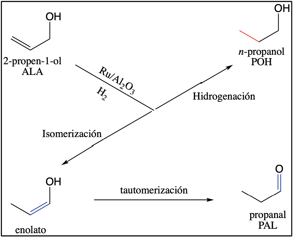 La selectividad hace referencia a la cantidad de un producto en particular que es obtenido a partir de una transformación química. En el caso de la reacción de isomerización del alcohol alílico bajo atmósfera reductora, es posible generar dos productos diferentes: el n-propanol y el n-propanal. La Figura 7, muestra las posibles vías de transformación.