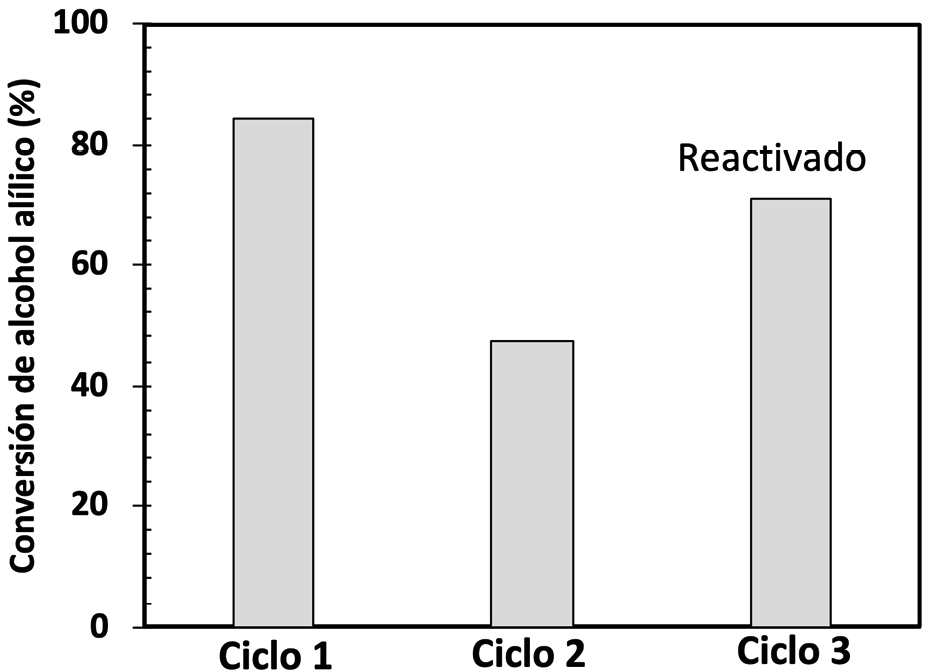 Para determinar la estabilidad del catalizador, el sólido recuperado se lavó después del uso respectivo con agua desionizada y se secó durante 12 h a 80ºC antes de realizar una nueva reacción. Este proceso se efectuó dos veces para completar tres ciclos de reuso. En el segundo ciclo, además de lavar y secar, se efectúa un proceso de reactivación en un flujo de hidrógeno a 350 °C por 4 h.