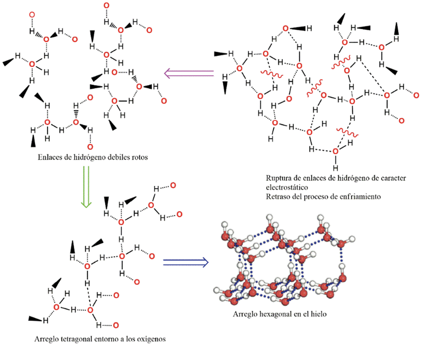 Enlaces de hidrógeno: En el agua, el enlace covalente H-O se acorta cuando libera energía, y simultáneamente el enlace de hidrógeno se alarga en un proceso de relajación (Zhang, et al., 2014). Lo anterior, es acorde con los estudios hechos mediante modelación teórica, donde se ha planteado que con un leve aumento de la temperatura, los puentes de hidrógeno se rompen, favoreciendo el incremento en el número de enlaces de hidrógeno fuertes (Tao et al. 2017). La formación de estos enlaces fuertes es requisito geométrico para la formación de pequeños clústeres, favoreciendo el entorno tetragonal sobre el oxígeno y una posterior reorganización de una capa hexagonal en el hielo, como se observa en la Figura 1, logrando así una congelación más rápida en el agua a mayor temperatura.