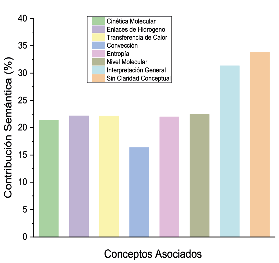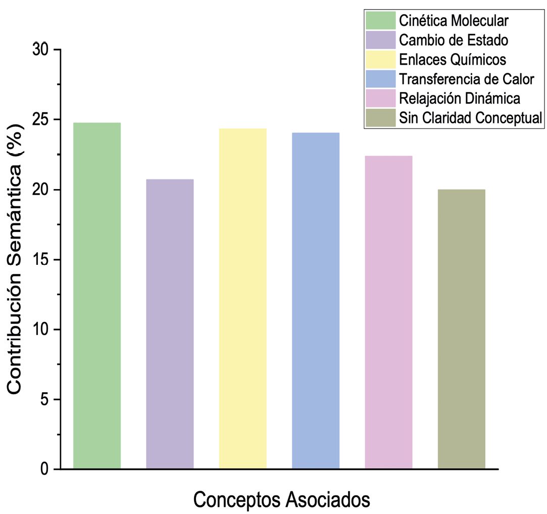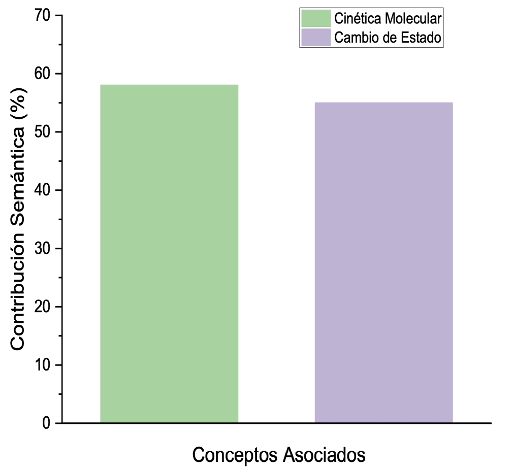 El análisis de la contribución semántica muestra que, en el segundo y tercer momento de la experiencia, hay un aumento de la complejidad conceptual para dar explicación al fenómeno, pudiéndose observar conceptos que hacen parte de la construcción de un mecanismo causal. Dentro de la primera parte relacionada a la identificación de entidades que intervienen en el proceso, la contribución semántica incluye las moléculas, átomos, electrones y pares electrónicos, mientras que en la segunda parte se identifican actividades relacionadas con las identidades como cinética molecular, transferencia de energía entre moléculas, enlaces de hidrógeno y entropía; sin embargo, no se observa contribución semántica que obedezca a patrones de organización como resultados de la correlación entre las entidades (moléculas) y las acciones que estas desarrollan para llegar al punto de solidificación mediante el efecto Mpemba. Acorde con este hallazgo, es claro que los estudiantes no alcanzan a llegar al nivel más complejo que implica la inclusión de conceptos relacionados con organización estructural de las moléculas en estado sólido.