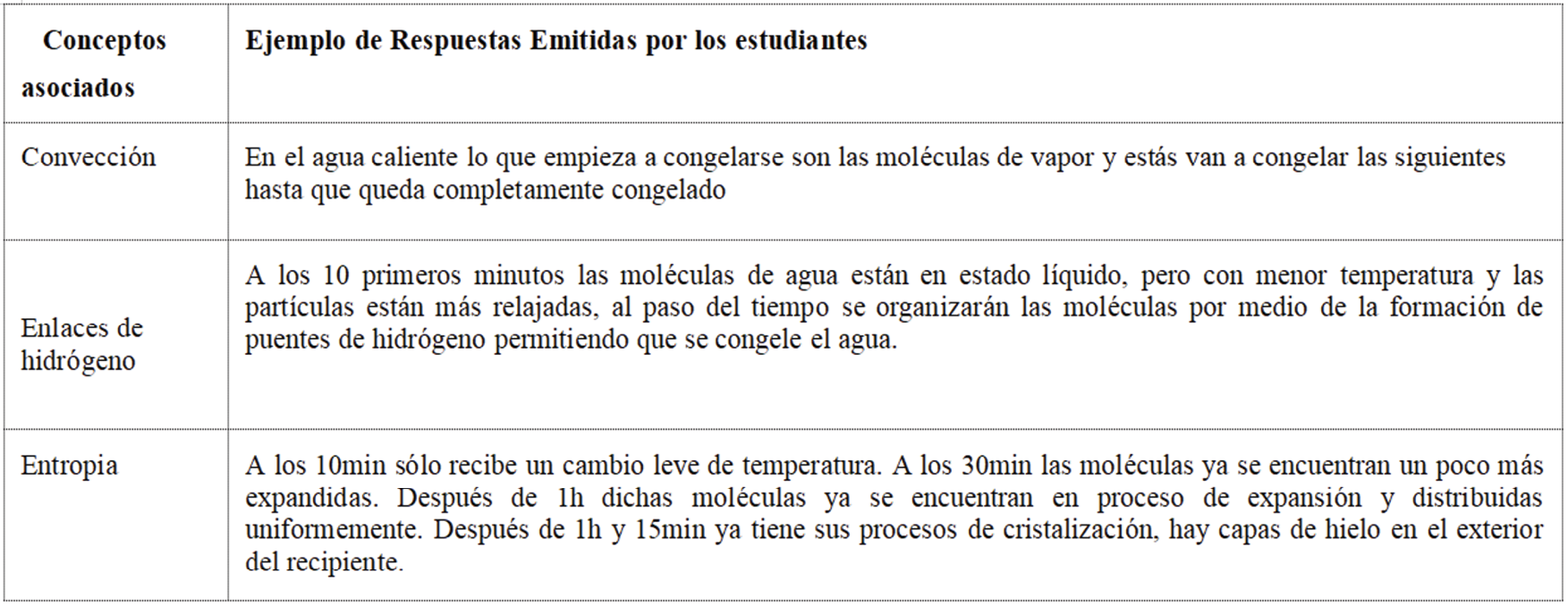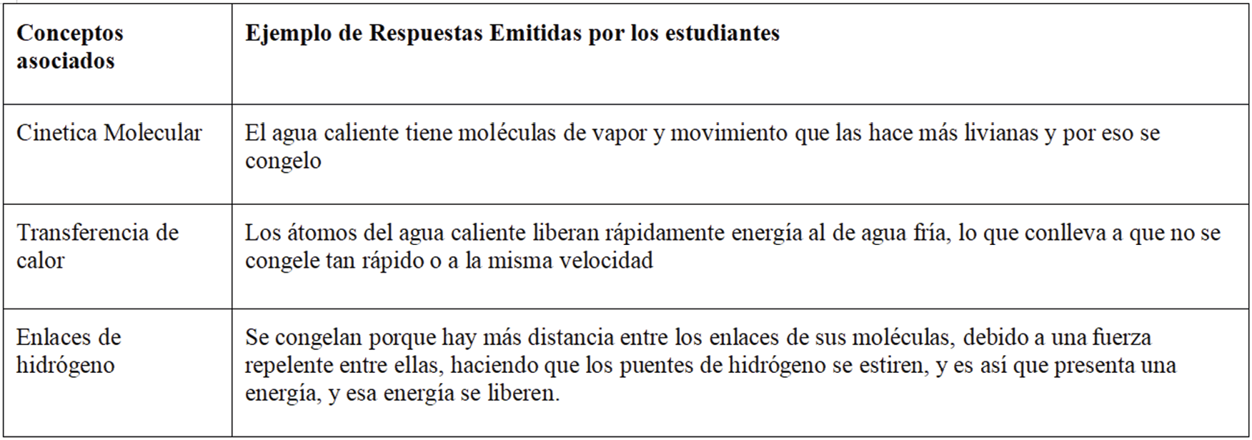 Finalmente, se les pide a los participantes que describan el comportamiento de las moléculas en agua fría a través del tiempo. Algunos aluden el cambio de los enlaces de hidrógeno, al bajar la temperatura. Sin embargo, no hay explicación clara sobre el mecanismo de cómo sucede el fenómeno a nivel molecular. En otras respuestas se relaciona la cinética molecular con la entropía a través de la temperatura. De manera menos específica está presente el concepto de convección como una interpretación del proceso de congelación, incluyendo la formación de una capa inicial que luego va creciendo. En este caso, se observa poca argumentación del mecanismo de transferencia de calor para la formación del sólido. Al concepto de transferencia de calor se pueden atribuir algunas de las respuestas, en que hay una relación entre la pérdida de calor de las muestras en relación con el tiempo; sin embargo, no explica la direccionalidad de la transferencia de calor.