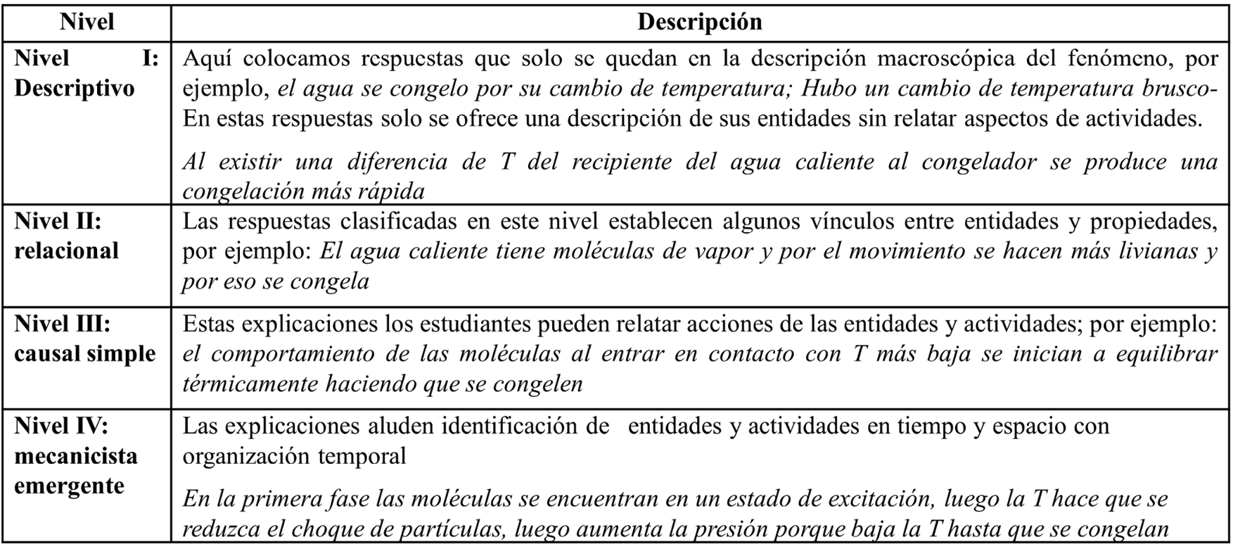 Con el propósito de poder identificar los niveles de razonamiento, en estudios previos (Talanquer, 2018) se han definido niveles de razonamiento: Nivel I (Descriptivo), incluye respuestas que son de naturaleza descriptiva y se limitan reafirmando el fenómeno en diferentes palabras; Nivel II (relacional) se basa en asociaciones simples entre propiedades de las principales entidades del sistema; Nivel III (causal simple), las explicaciones se basan en las actividades de uno o más de las entidades del sistema; y Nivel IV (Emergente Mecanicista), se refieren a una organización de entidades y actividades en el espacio y tiempo para darle sentido al fenómeno. Grotzer (2003) indica que las explicaciones mecanicistas se caracterizan por el detalle en las descripciones de los procesos que son responsables del comportamiento de un sistema de interés y se basan en la identificación de entidades en un sistema, sus propiedades e interacciones, las actividades en las que participan, y los patrones de organización que manifiestan (Machamer et al., 2000). Illari (2011) señala que un mecanismo para un fenómeno consta de entidades y actividades organizadas de tal manera que son responsables del fenómeno.
