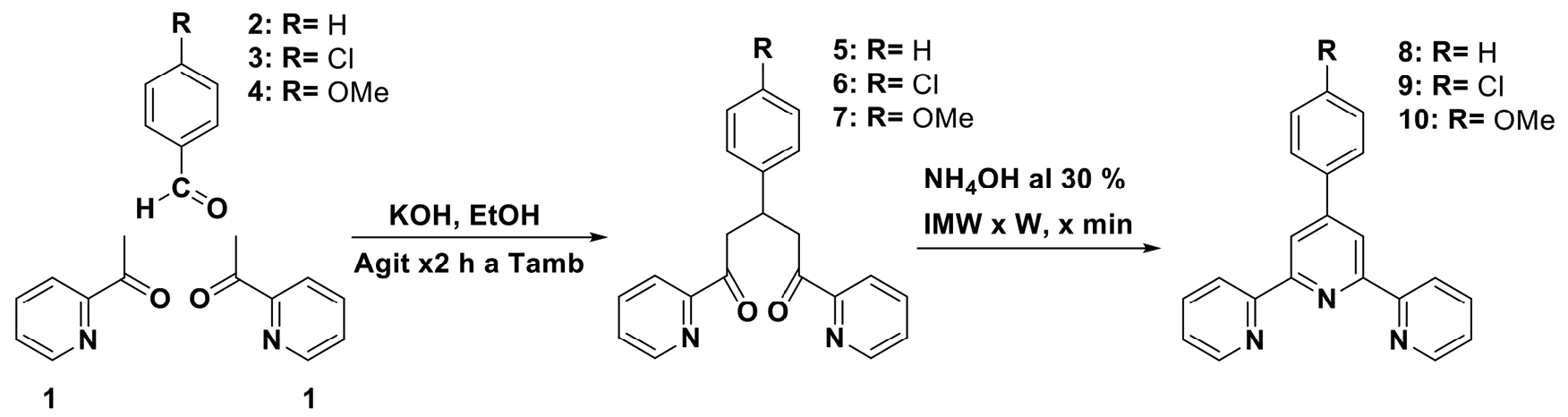 Así pues, en este trabajo se reporta la síntesis de tres derivados terpiridínicos (8-10) mediante la metodología de ensamblaje de anillos, reacción de Kröhnke, a partir de la condensación de 2-acetilpiridina con aldehídos aromáticos y utilizando radiación microondas como fuente de calentamiento. Las condiciones de reacción fueron parametrizadas con la realización de un Diseño Experimental 3x2 estableciéndose las condiciones óptimas de potencia y tiempo de irradiación, para su posterior síntesis, purificación y caracterización.