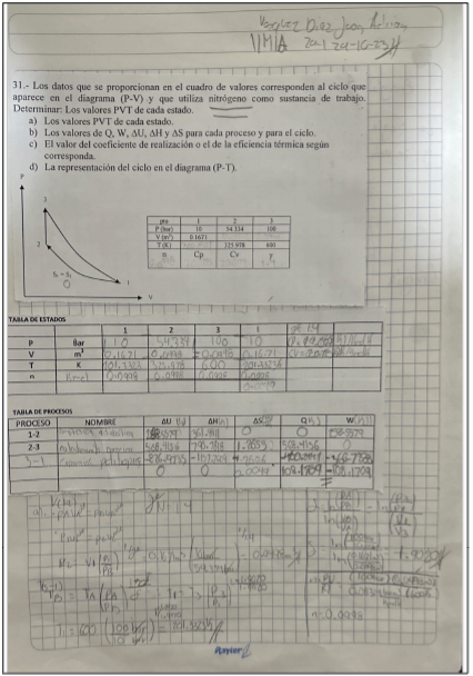 Figura 2. Ejemplo de un ejercicio extraclase para el tema procesos y ciclos termodinámicos.