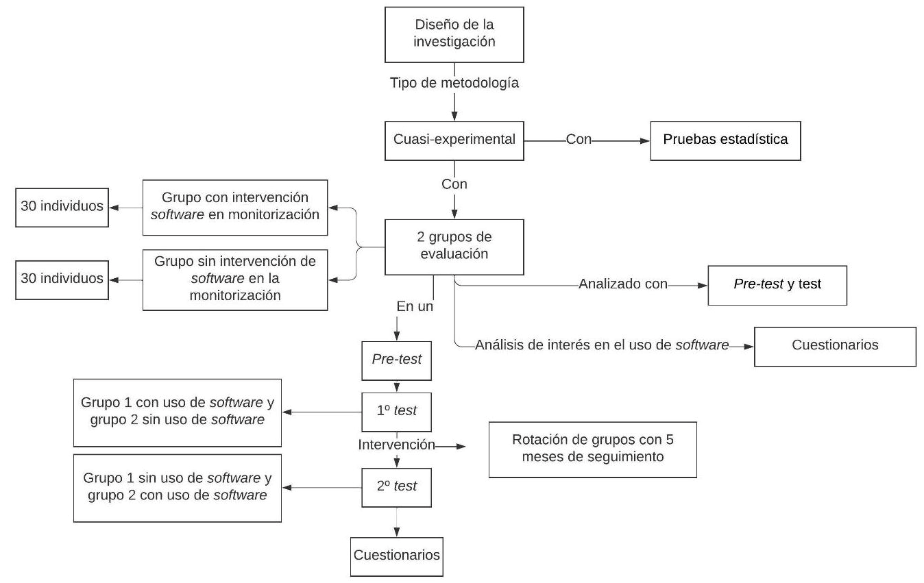 Los estudiantes fueron divididos en dos grupos: G1 - grupo cuyo monitoreo fue utilizado software educativo y G2 - grupo con clases de monitoreo sin el uso de software educativo. Como criterio de evaluación, con 5 meses de seguimiento, se aplicó la segunda fase del estudio, donde ambos grupos tuvieron clases de seguimiento utilizando software educativo. El diseño experimental para el desarrollo de la investigación se puede ver en la Figura 1.